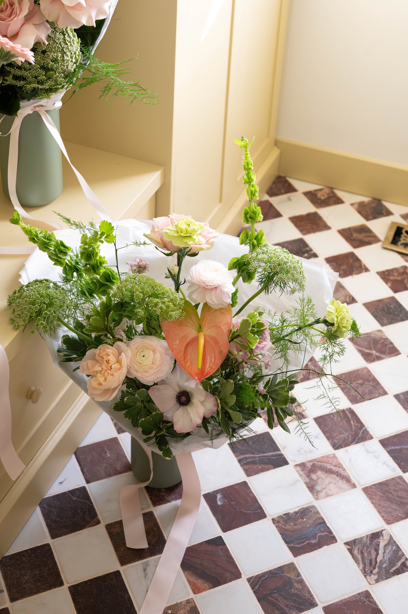 Designed in our studio with love, our Strawberry Matcha Mixed Bouquet combines a stunning mix of the most beautiful on-trend pink and green flowers. It will be a dreamy blend of soft blush strawberry pinks and fresh matcha greens, inspired by everyone’s favourite sweet treat. Featuring anthuriums, ranunculus, blush nerine, bells of ireland and more.