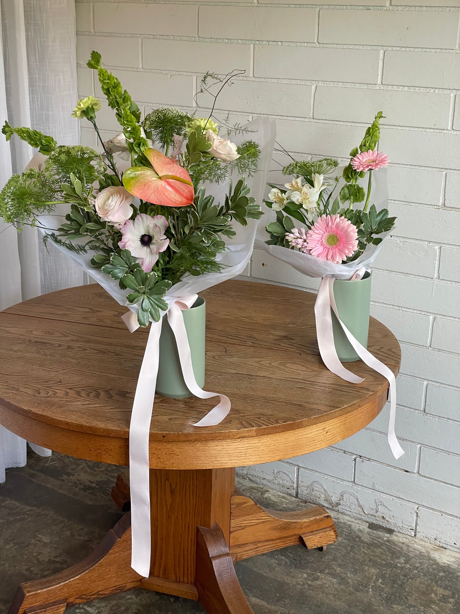 Each bouquet comes wrapped in paper and tissue paper in our tall white bouquet boxes with a paper cup of water for the bouquet to travel in.